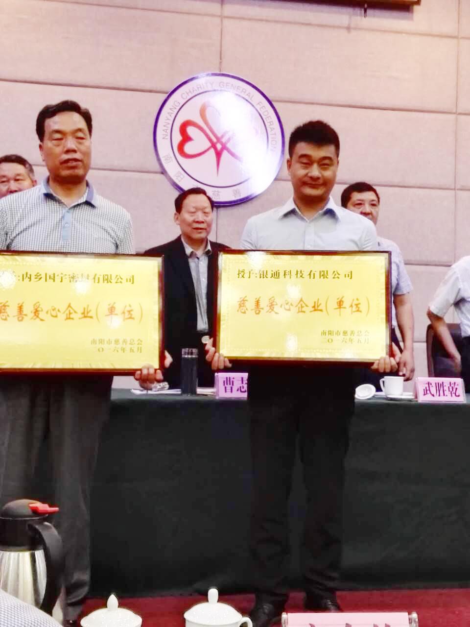 南陽銀通近年來連續獲得南陽市慈善總會愛心企業,董事長王寶玉先生連年榮獲先進個人榮譽稱號并擔任慈善總會理事會副會長職務。南陽銀通自成立以來始終以“誠信、高效”為理念,以“質量為本,服務至上”為宗旨,“慈善和愛心”為義務,努力創造優質產品,打造良心企業。