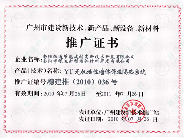 南陽銀通廣州市建設新技術、新產品、新設備、新材料推廣證書
