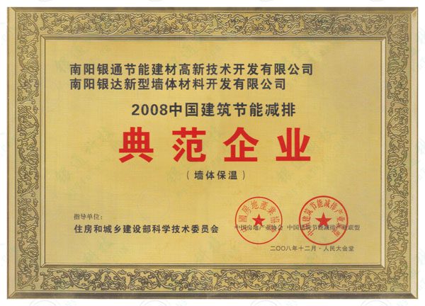 此證書為往年曾獲證書,本介紹頁僅為方便用戶了解企業(yè)歷史資質(zhì),望悉知 南陽銀通節(jié)能建材高新技術開發(fā)有限公司 南陽銀達新型墻體材料開發(fā)有限公司 2008中國建筑節(jié)能減排典范企業(yè)(墻體保溫)指導單位:住房和城鄉(xiāng)建設部科學技術委員會 中國房地產(chǎn)業(yè)協(xié)會 中國建筑節(jié)能減排產(chǎn)業(yè)聯(lián)盟 二00八年十二月·人民大會堂