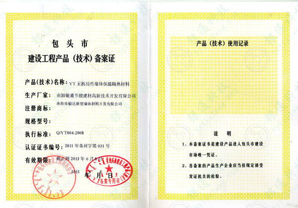 包頭市建設工程產品(技術)備案證 產品(技術)名稱:YT無機活性墻體保溫隔熱材料 生產廠家:南陽銀通節能建材高新技術開發有限公司 南陽市銀達新型墻體材料開發有限公司 執行標準:Q/YT004-2008 認證證書編號:2011年備材字第031號 有效期:截至到2013年6月8日 包頭市建設工程產品(技術)備案專用章 2011年6月8日 產品(技術)使用記錄 說明:1.本備案證書是建設產品進入包頭市建設市場唯一憑證。 2.各備案的產品生產企業應當按規定接受發證機關的檢驗。