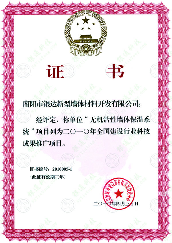 2010全國建設行業科技成果推廣項目證書 有效期:三年 。 頒發時間 2010年4月30日
