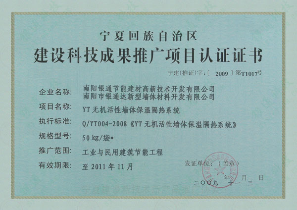 寧夏回族自治區(qū) 建設(shè)科技成果推廣項(xiàng)目認(rèn)證證書 有效期至2011年11月