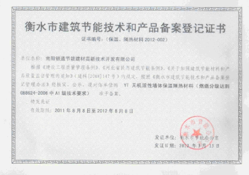 YT無(wú)機(jī)活性墻體保溫隔熱材料衡水市建筑節(jié)能技術(shù)和產(chǎn)品備案登記證書(shū) 有效期限:2011年8月8日至2012年8月8日