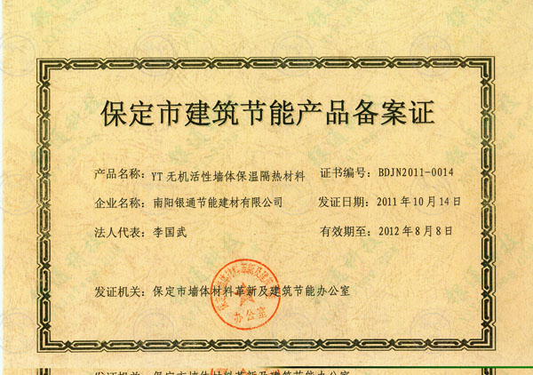 河北保定市建筑節(jié)能產(chǎn)品備案證 產(chǎn)品名稱 YT無機活性墻體保溫隔熱材料 證書編號BDJN2011-0014 企業(yè)名稱 南陽銀通節(jié)能建材有限公司 發(fā)證日期2011年10月14日 有效期至2012年8月8日 發(fā)證機關 保定市墻體材料革新及建筑節(jié)能辦公室