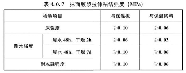 4.0.7 抹面膠漿拉伸粘結強度應符合表4.0.7的規定。抹面膠漿與保溫材料的粘接在原強度、浸水48h且干燥7d后的耐水強度條件下發生破壞時,破壞部位應位于保溫材料內。