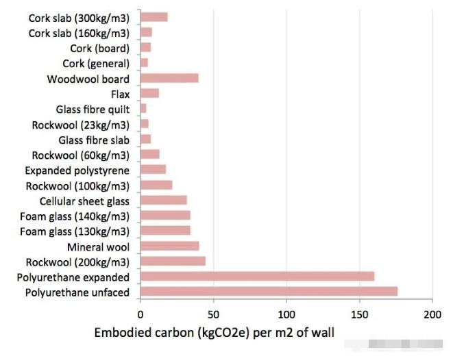 上面的表圖,但從厚度角度,肯定是厚度越厚,體積越大。我們下面來對比材料的隱含碳排放。隱含碳是指任何一種產品的生產,都會直接或間接地產生碳排放,為了得到某種產品,而在整個生產鏈中所排放的二氧化碳。那么,越是那些化工產品,可能經過了很多工藝,引起的隱含碳就越高。越是依靠天然材料就能加工制作的材料,其隱含碳就越少。下面這個就是各種保溫材料的隱含碳對比