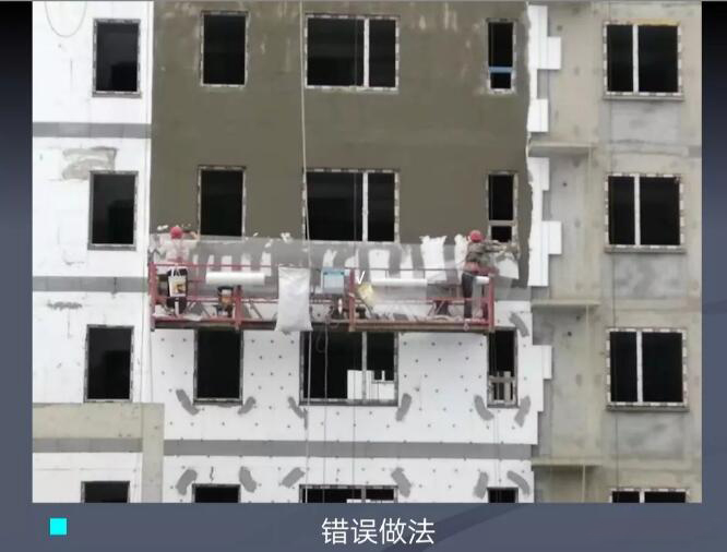 正確做法:玻纖網要夾在抹面層中間,即先把底面抹勻再掛玻纖網,再抹一邊砂漿。抹面層保護保溫層并起著防裂防水抗沖擊和一定防火作用。