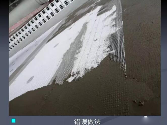 錯誤原因:纖維網底面未抹砂漿或只有一點砂漿就掛玻纖網。