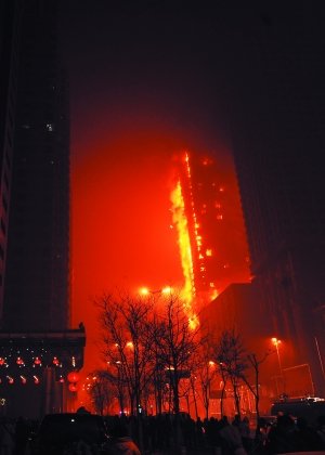 記者站在距大廈一兩百米遠的地方仰望大廈,150多米高的B座公寓樓西側和南側火勢最大,團團火苗和濃煙從墻體上升起,大火迅速向大廈內部蔓延,一個個窗戶內接連噴出火苗,大火燃燒發出陣陣響聲,并不斷掉下一些燃燒物。兩個高架水槍升空雖然達到幾十米,仍然對高處大火無可奈何。大火在燃燒1個多小時后,又向200多米高的A座主樓蔓延,主樓很快也燃起大火。