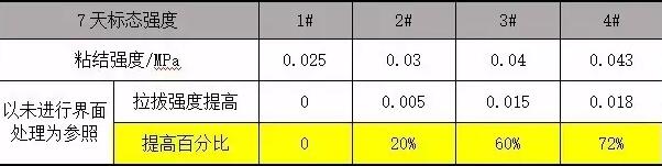 經過7天后,測試標態強度,:其中乳液+水泥+砂子的強度最大,乳液+水泥的強度次之,兩者都大于純乳液界面劑處理后的強度,未做界面處理的強度最低。