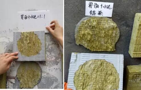 專業人員曾做過一組對比試驗,在墻上粘貼4組巖棉板,包括未涂刷界面劑的、涂覆乳液狀界面劑的、涂覆按照乳液:水泥=1:1界面劑的、涂覆乳液:水泥:混合砂=1:1:1界面砂漿。