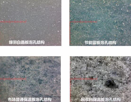 下面是四種擠塑板的微觀結(jié)構(gòu)圖。白晶板的泡孔均勻且封閉。藍(lán)板泡孔封閉良好。黑板沒有泡孔基本沒有封閉。