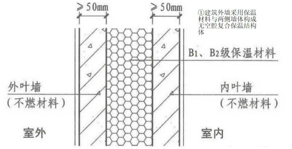 ①是最特殊的,現在應用較少的一種情況,保溫材料夾在墻體中間,墻體既有支撐作用又有防護作用要求墻體厚度不小于50mm。采用B1、B2級材料時用A級材料在樓板處進行隔離,高度不小于300mm,防止下一層著火,延保溫層豎向蔓延。就想前面提到的火災一樣。