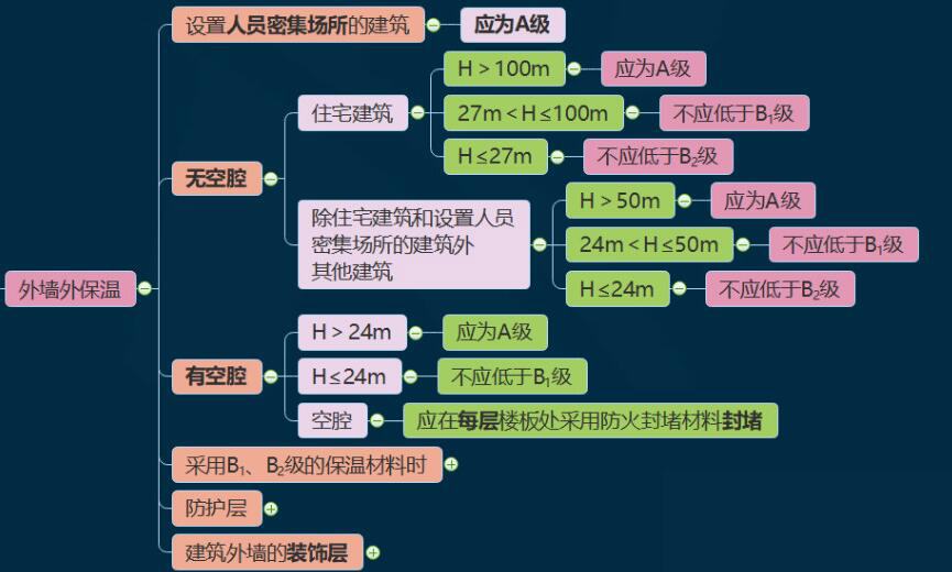 現在建筑外墻外保溫應用較多,形式也更多樣,分為無空腔和有空腔。除了人密必須A級之外,其他建筑首先要看是有空腔,還是無空腔再來確定保溫材料的最低耐火等級。有空腔因為容易在空腔部位產生煙筒效應更加危險,要求比無空腔也更加嚴格。