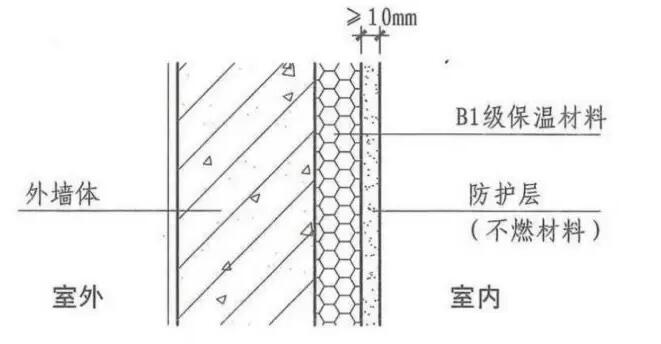 建筑內保溫人密(人多,發生火災不利于疏散),用火油氣(火災危險性大的場所),疏散通道(著火了要從這些地方跑或避難)采用A級;其他B1級并且因為是室內如果產生有毒煙氣會造成人員傷亡要求低煙低毒。下圖為內保溫采用B1級材料時,防護層設置示意圖。