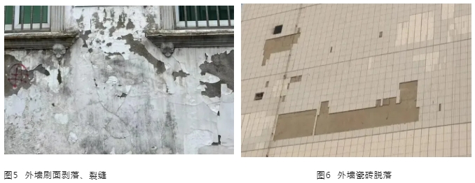 2)外墻面。外墻刷面剝落、產(chǎn)生裂縫(圖5—6)。滲漏一般在裂縫、梁底、柱與磚墻的交界處,尤其以東西山墻和頂層部位滲水較為嚴(yán)重。